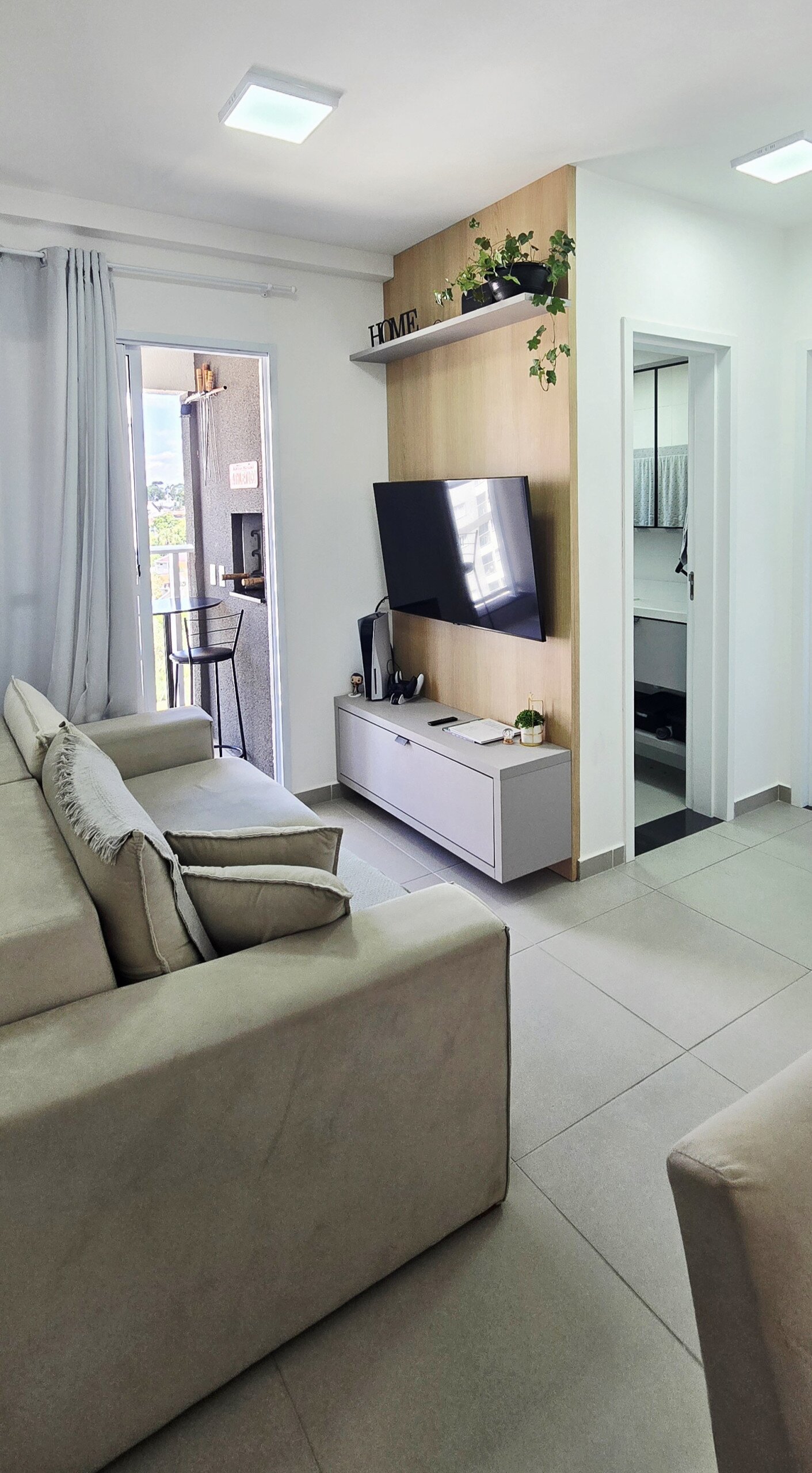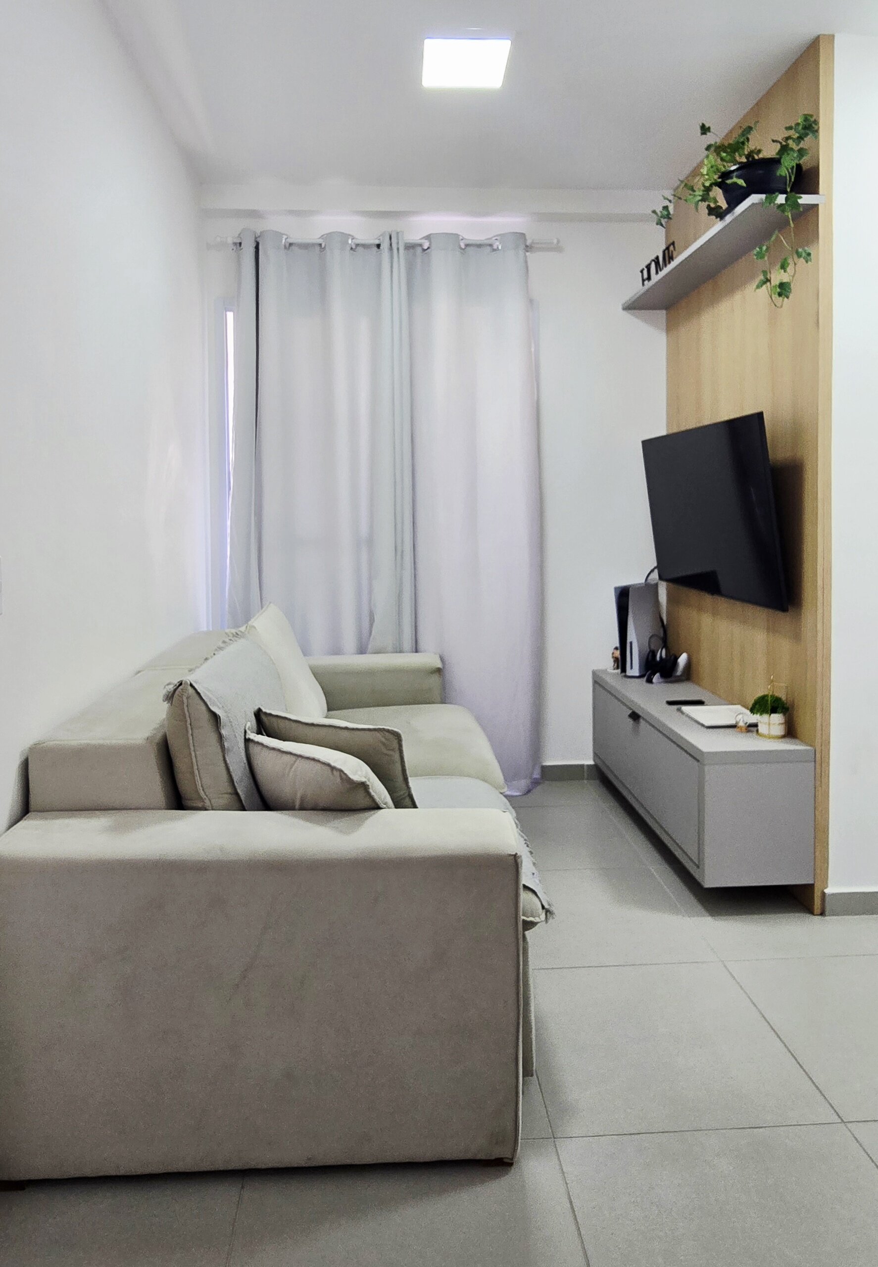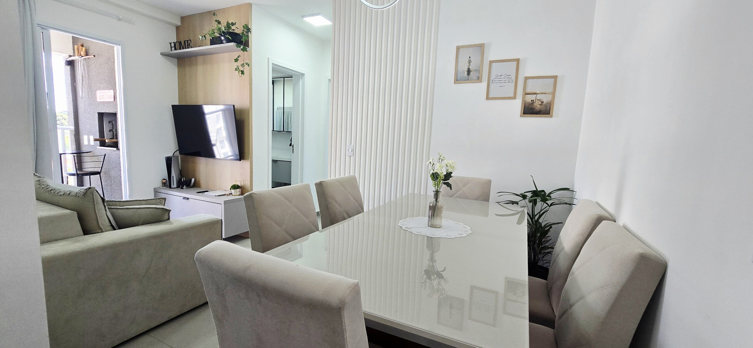 Sala para dois ambientes com painel de TV.