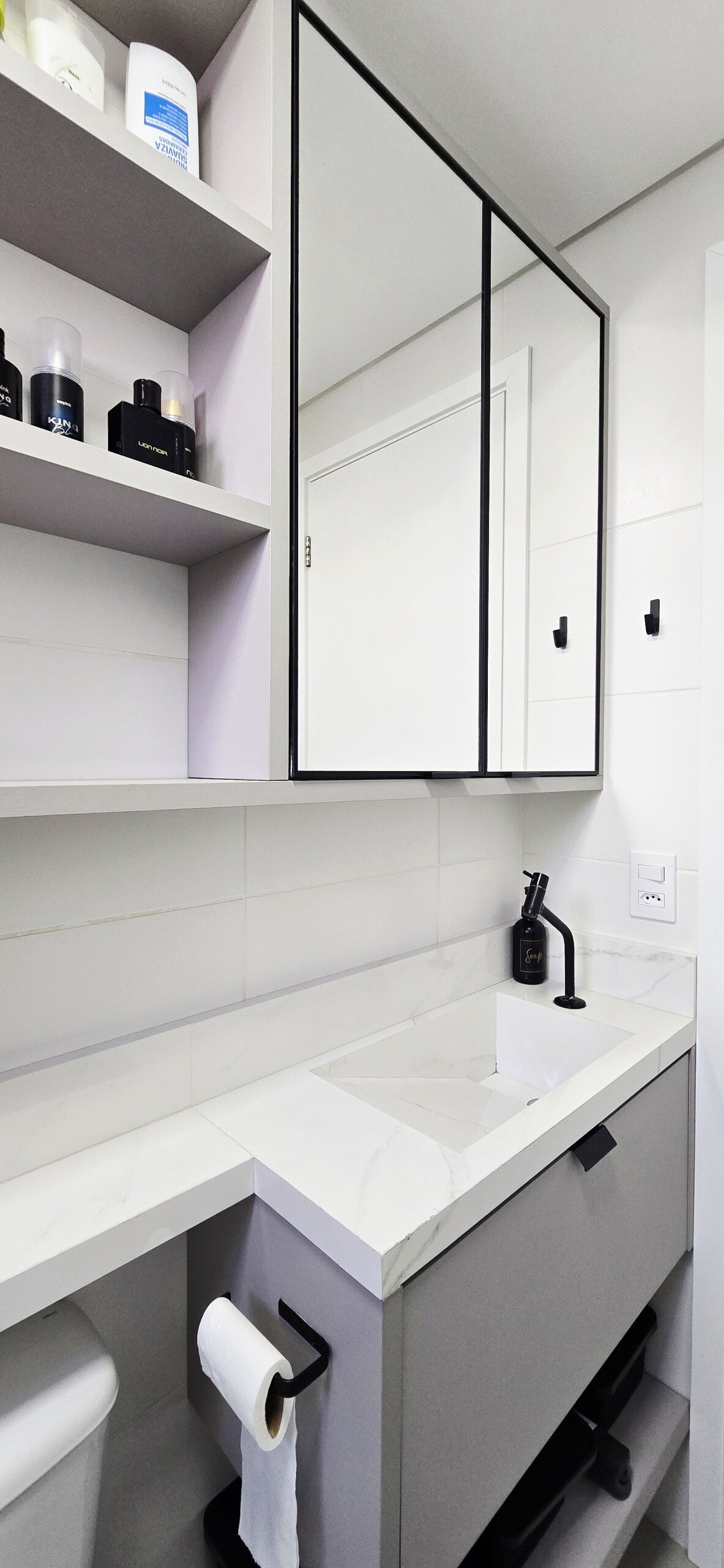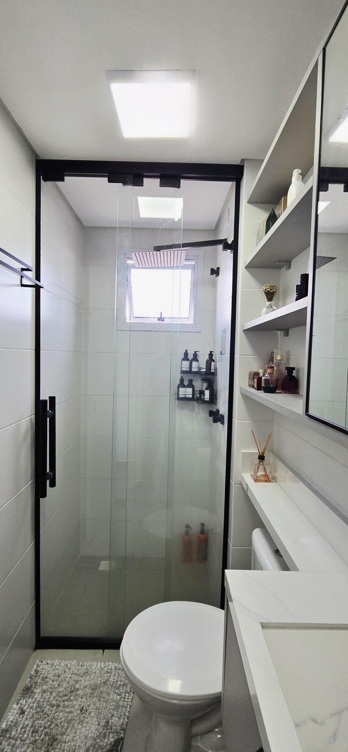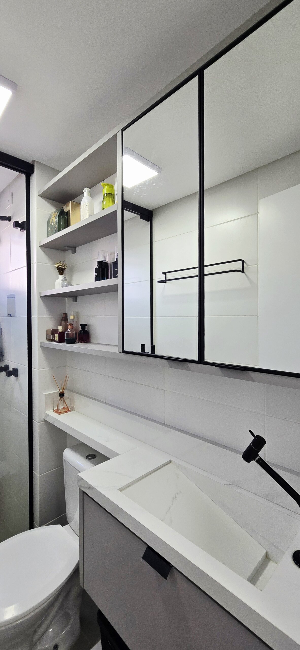 Banheiro social com armários planejados e box de vidro.