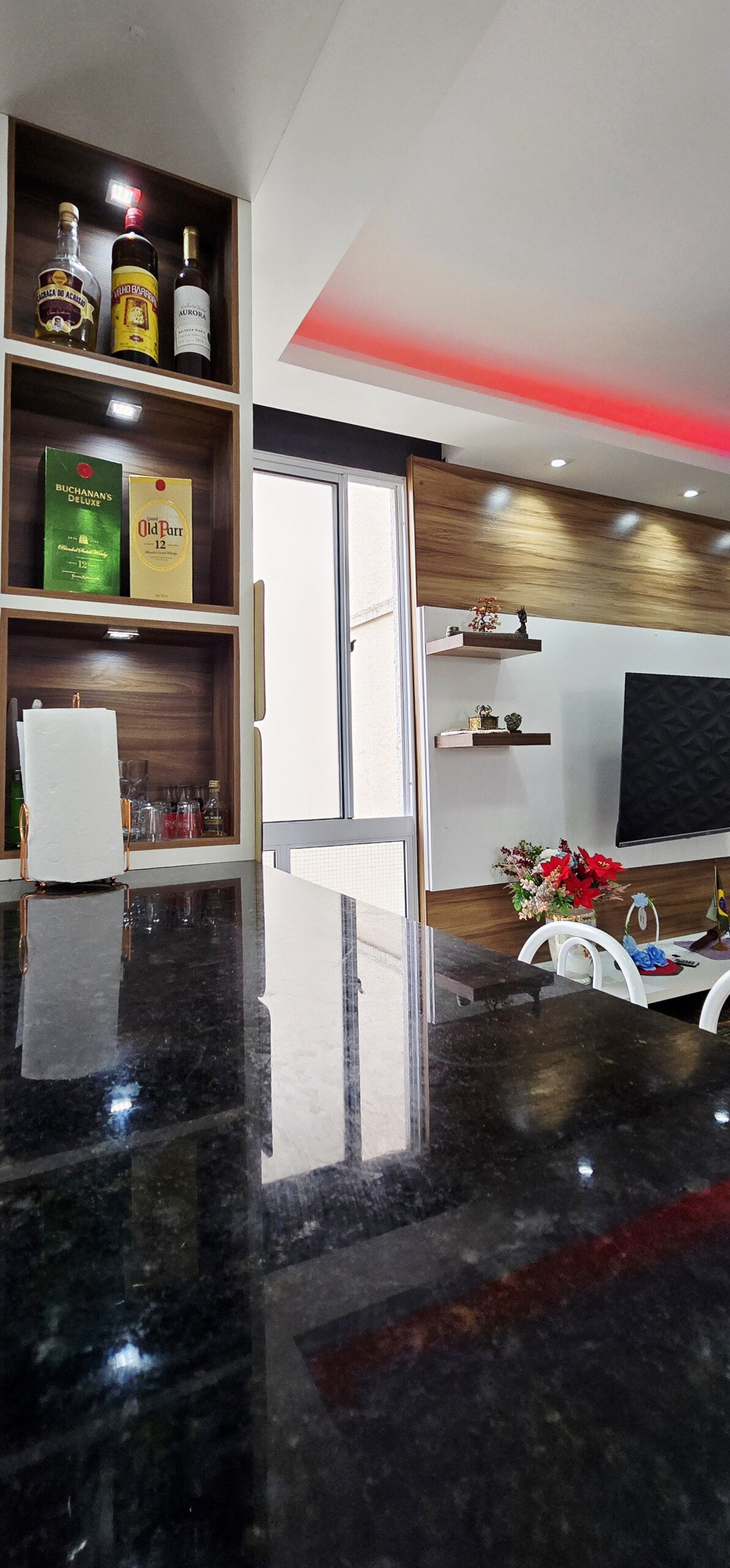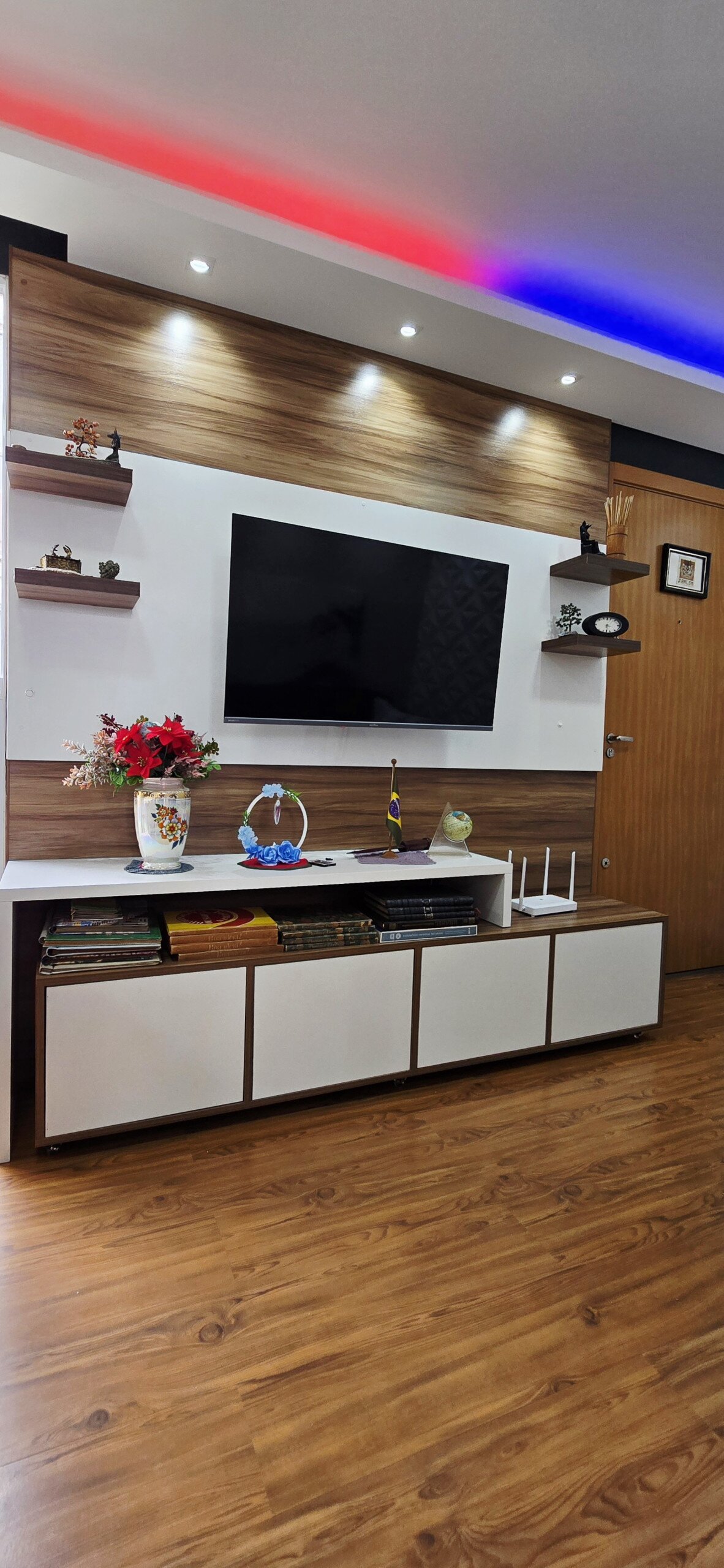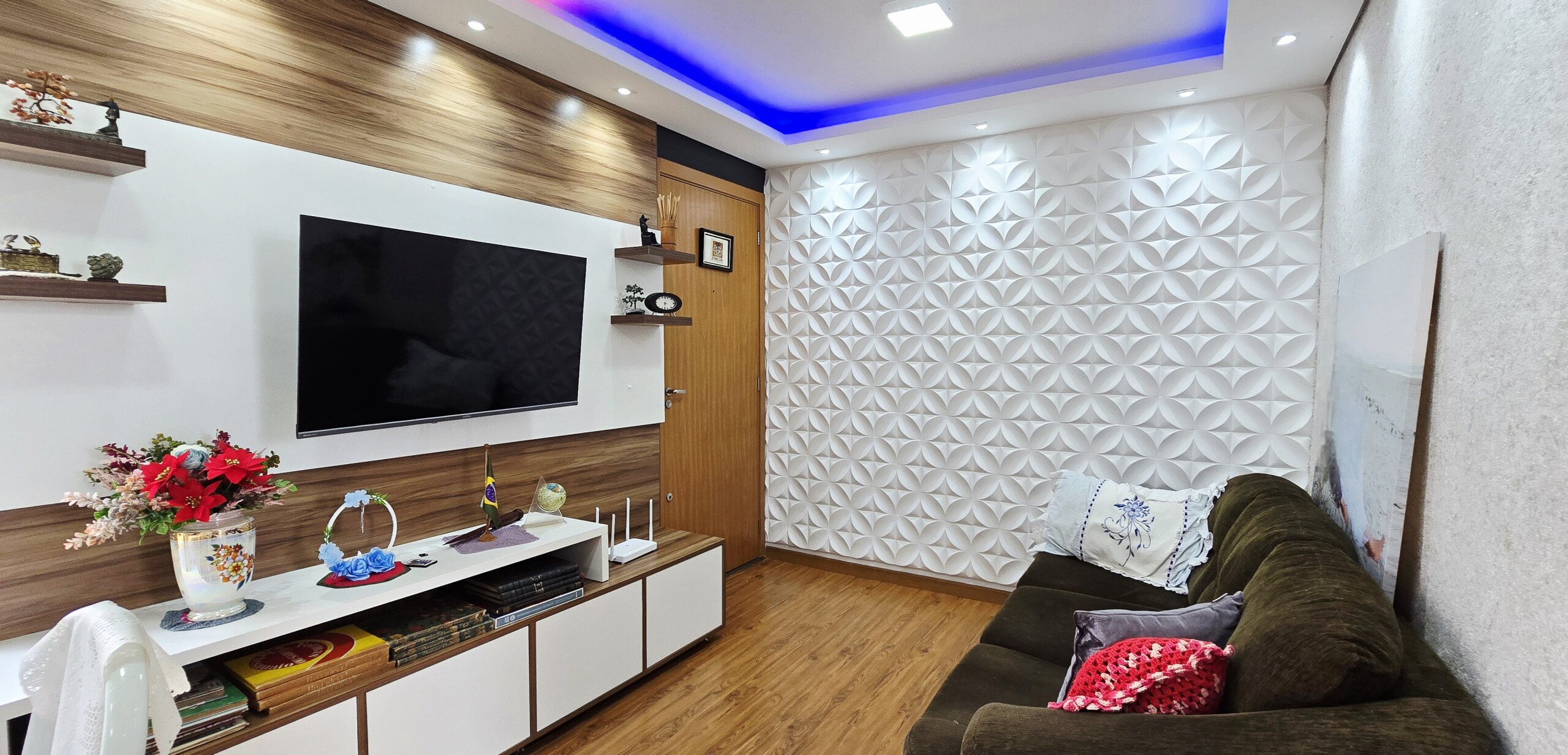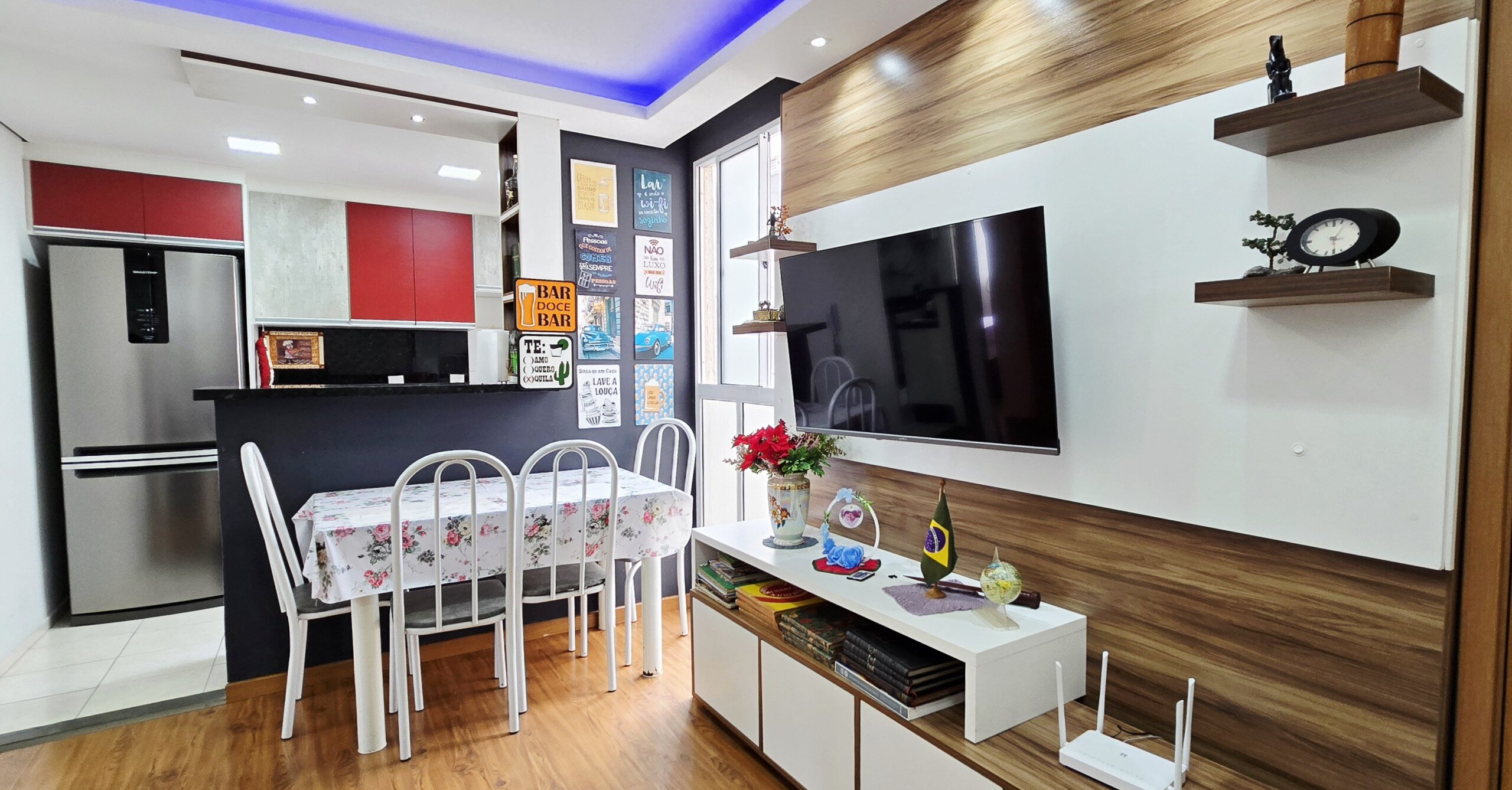 • Sala de estar e jantar integradas com painel de TV