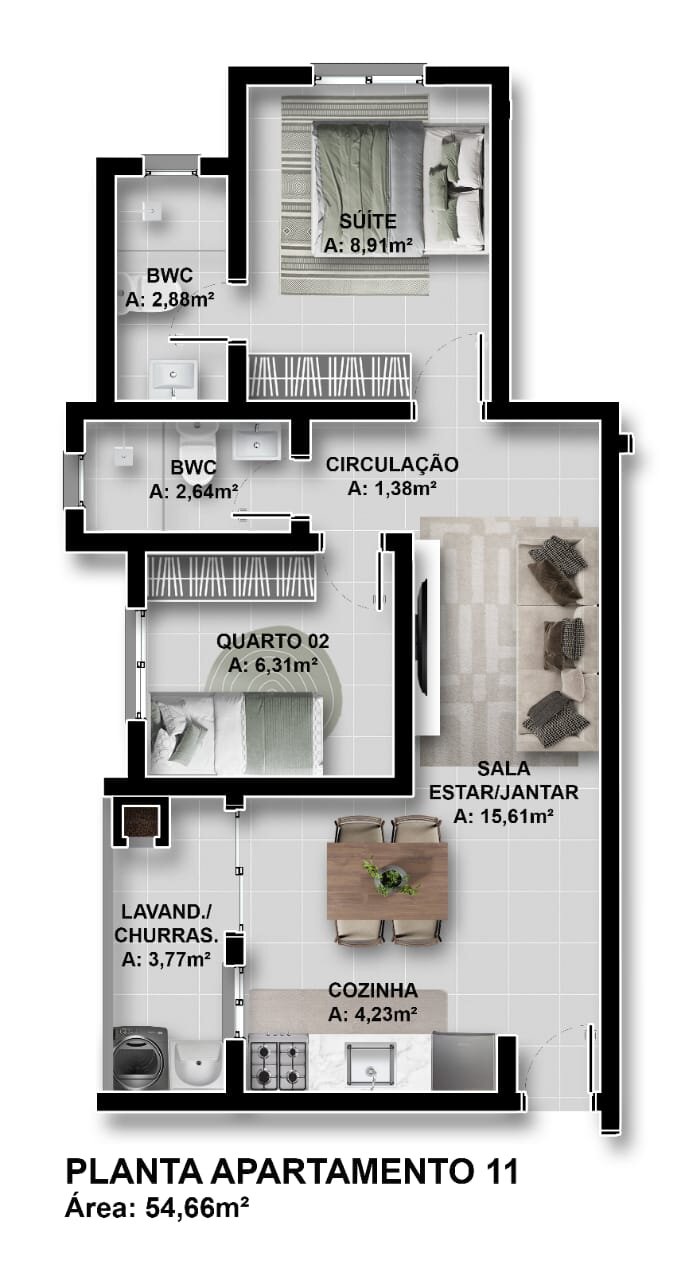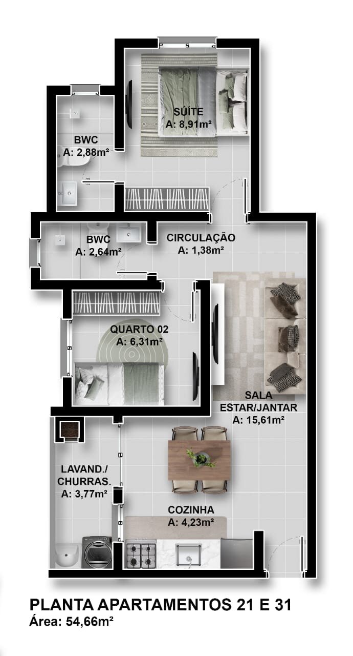 Apartamento 31 - 2 Quartos sendo 1 Suíte - R$ 331.960,00