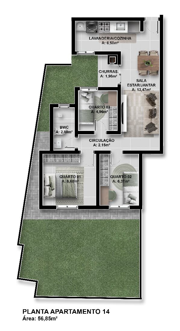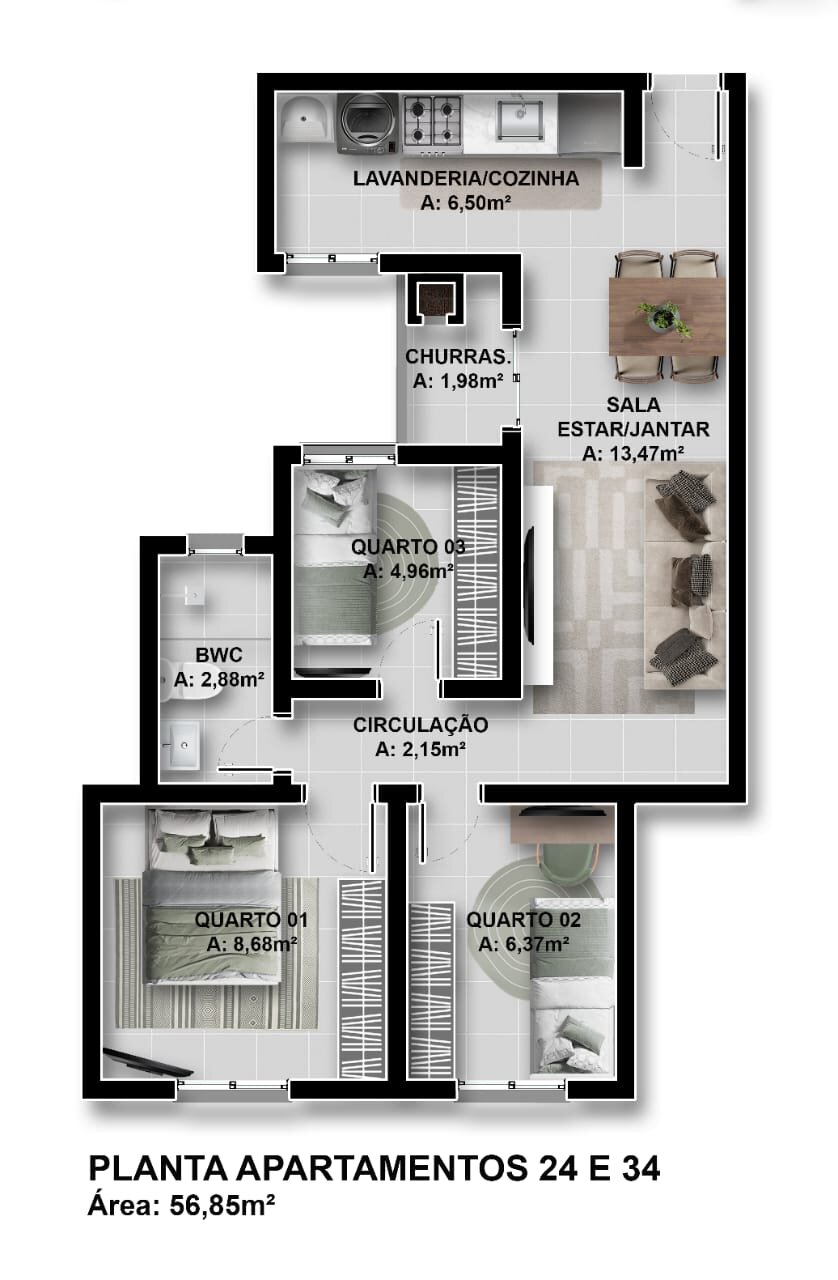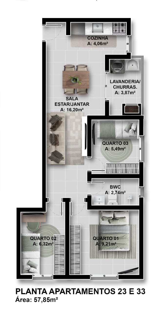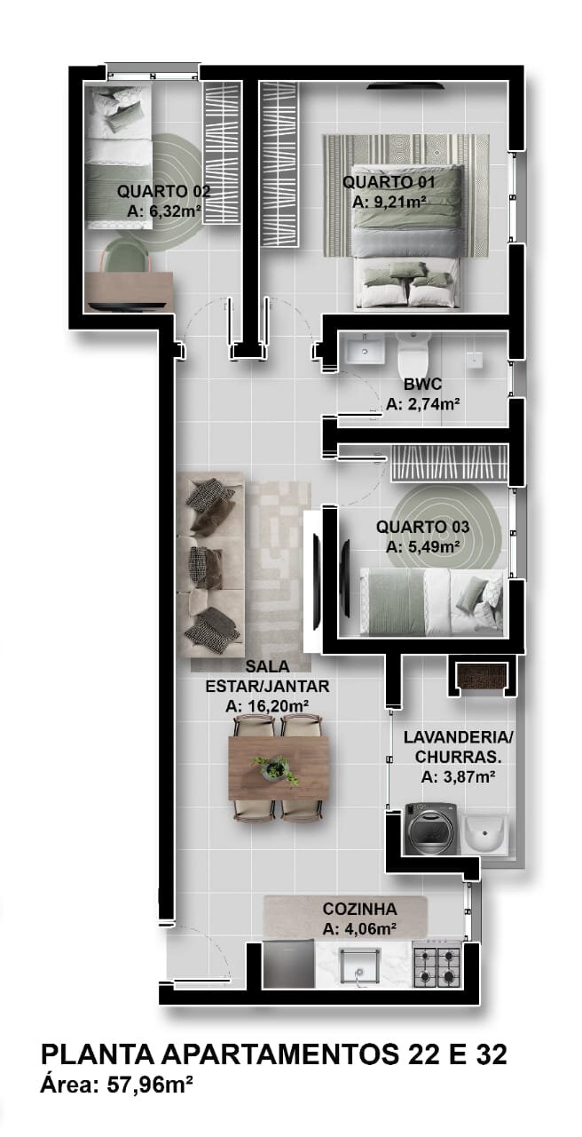Apartamento 32 - 3 Quartos, 1 Banheiro Social - R$ 343.066,00