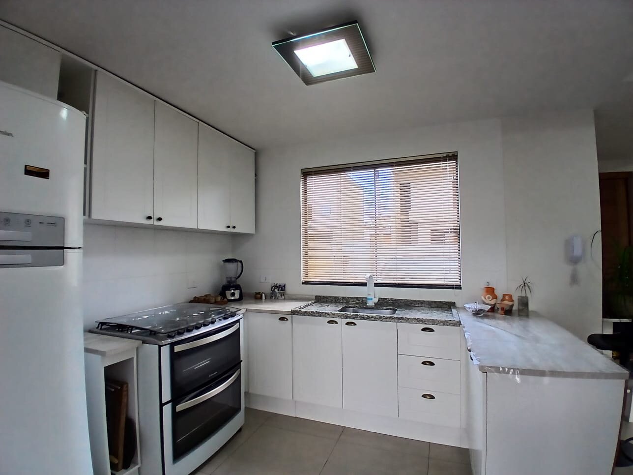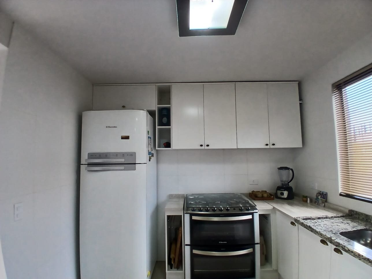 A cozinha conta com móveis planejados e ótimo aproveitamento de espaço. Na parte externa, o imóvel já possui churrasqueira a carvão com pia em granito, pronta para uso.